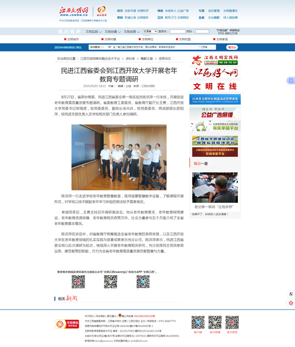 8月27日,省政协常委、民进江西省委会原一级巡视员陈洪萍一行来校,开展促进老年教育高质量发展专题调研。省委教育工委委员、省教育厅副厅长王勇,437必赢会员中心党委书记贺瑞虎,校党委委员、副校长徐光兵,校党委委员、统战部部长欧阳萍,校民进支部负责人及学校相关部门负责人参加调研。
