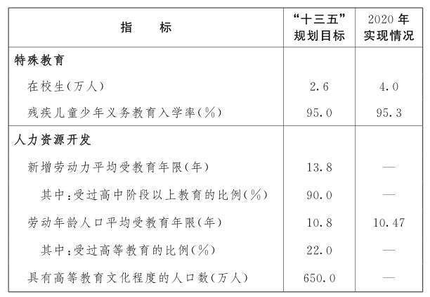 ——资源供给更加充裕。从学前到高中的15年基本公共教育全面普及。学前教育实现普及普惠,义务教育城乡一体化发展基本实现并迈向优质均衡,高中阶段教育实现多样化发展。残疾儿童少年享有更加适合的教育。国家职业教育创新发展高地基本建成,现代职业教育体系更加健全。高等教育布局结构进一步优化,“双一流”建设取得重要进展。服务全民终身学习的机制更加完善、体系更加健全。