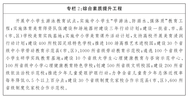 全面落实“双减”政策,强化学校教育主阵地作用,深化校外培训机构治理,构建教育良好生态。抓好中小学生作业、睡眠、手机、读物、体质等管理,禁止中小学生带手机进入课堂;加强对教辅、课外读物等教学材料的审核,完善对地方课程、校本课程的评估监测,三年内确保减轻学生过重作业负担和校外培训负担、家庭教育支出和家长相应精力负担成效显著。完善学校体育美育设施,推进音体美教育教学条件全面达到国家标准。健全“健康知识+基本运动技能+专项运动技能”的体育教学模式,开齐开足上好体育课,推动足球、篮球等教学改革,推广中华传统体育项目;实施《关于开展中小学生游泳教育试点工作行动方案》,推动各地普及游泳运动;常态化组织学生体育锻炼,帮助每个学生至少熟练掌握1项终身受益的运动技能,全面增强学生体质。完善“艺术基础知识基本技能+艺术审美体验+艺术专项特长”的美育教学模式,开齐开足上好美育课,推进艺术课程改革,丰富艺术实践活动,让每个学生至少具有1项艺术爱好、形成1项艺术特长,全面提升学生审美和人文素养。支持大中小学校建设健康教育管理中心,配齐配强心理健康教师,开好心理健康教育课和生命教育课。利用大数据技术常态化开展学生心理普查,分级建立学生心理问题档案,提高心理问题识别和危机干预精准度,全面提高学生心理素质。广泛开展新时代校园爱国卫生运动,加强健康教育,将生态文明教育纳入日常教育,倡导绿色低碳、文明健康生活方式。全面防控儿童青少年近视,引导学生形成良好的学习生活习惯。