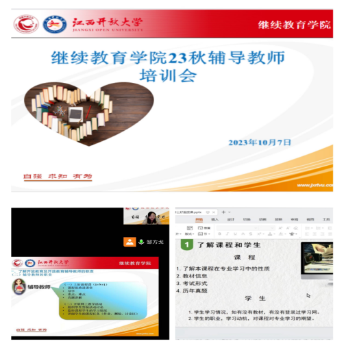 为进一步规范教学管理,提升教学与服务质量,持续推进开放教育创优提质,10月7日下午,学院通过腾讯会议方式组织开展2023秋开放教育辅导教师培训,培训会由学院教学科科长邹方戈主持,学院副院长李龙光、邹方戈老师、学校第一届教学标兵罗曦老师进行指导培训,共计40余名辅导教师参加此次培训会。