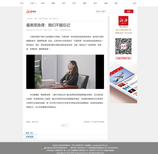 张戈的“最美思政课”《我们不能忘记》获得中方面专家的肯定。为此,江西新闻客户端以特别报道的形式,发布了相关新闻。