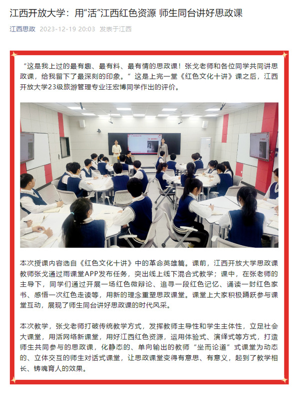 “这是我上过的最有趣、最有料、最有情的思政课!张戈老师和各位同学共同讲思政课,给我留下了最深刻的印象。”这是上完一堂《红色文化十讲》课之后,23级旅游管理专业汪宏博同学作出的评价。
