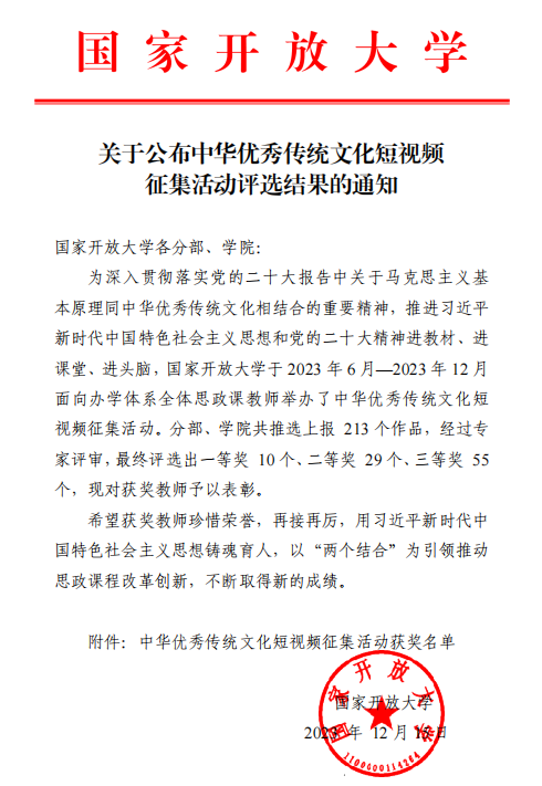 【喜讯】我院教师在国家开放大学中华优秀传统文化短视频征集活动评比中再创佳绩