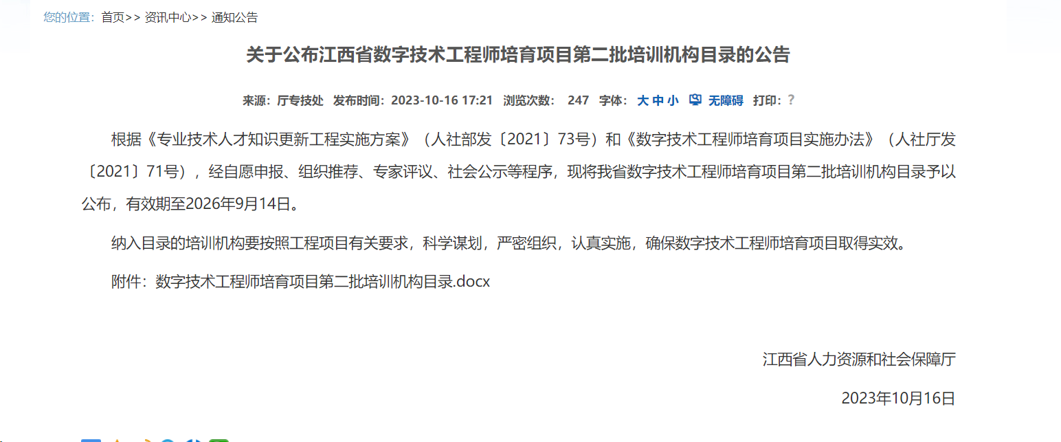 近日,江西省人力资源和社会保障厅公布了江西省数字技术工程师培育项目第二批培训机构目录,必赢官网社会教育学院联合智能技术学院申报的人工智能工程技术人员培育项目培训机构成功获评。
