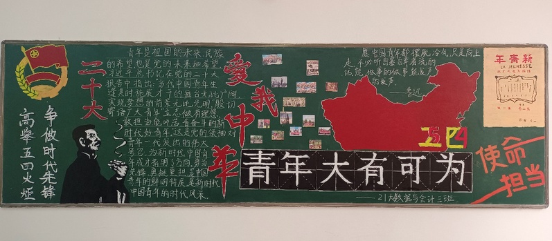 为深入学习贯彻党的二十大精神,弘扬爱国、进步、民主、科学的五四精神,切实加强校园文化建设,营造知校、爱校、荣校的校园氛围,数字经济学院开展了以“高举五四火炬 争当时代先锋”为主题的黑板报绘制活动。