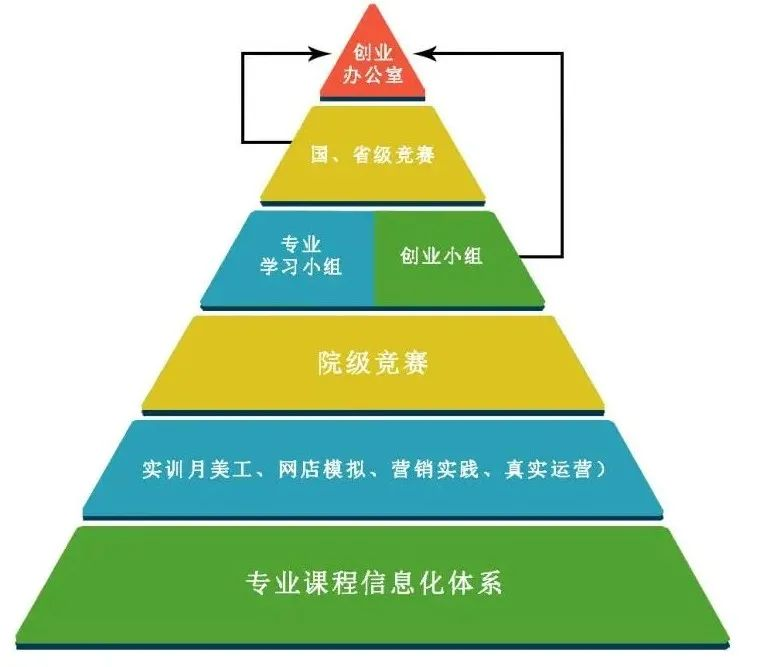 “六层级育人金字塔”育人模式为:在第一学年,通过课堂教学努力培养学生的专业知识和技能水平,通过面授和线上教学的方式尽可能为学生们奠定良好的知识和技能基础;在第二学年,选拔有意向、有兴趣和知识技能水平较好的学生进入到校级竞赛和创业小组中,通过初级竞赛和创业过程,进一步优化学生们的专业知识和团队协作能力,实现部分学生的进阶培优;第三学年,在前期培优学生的基础上,继续选拔实力突出且有兴趣的学生参加国家级、省级技能竞赛和创业大赛以及真实项目创业孵化团队中,实现专业教学中最优质人才的聚集和培养。