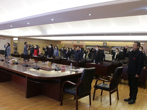 面对庄严的国旗,在科研处处长张睿同志的带领下,2022年度新入职教职工和新提拔使用干部右手举拳,郑重宣誓:忠于中华人民共和国宪法,维护宪法权威,履行法定职责,忠于祖国、忠于人民,恪尽职守、廉洁奉公,接受人民监督,为建设富强民主文明和谐美丽的社会主义现代化强国努力奋斗!