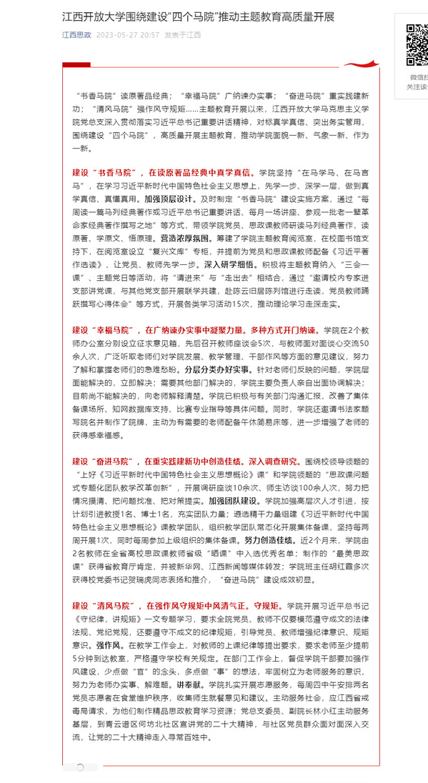 “书香马院”读原著品经典;“幸福马院”广纳谏办实事;“奋进马院”重实践建新功;“清风马院”强作风守规矩……主题教育开展以来,437必赢会员中心马克思主义学院党总支深入贯彻落实习近平总书记重要讲话精神,对标真学真信、突出务实管用,围绕建设“四个马院”,高质量开展主题教育,推动学院面貌一新、气象一新、作为一新。