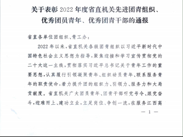 日前,共青团江西省直属机关工作委员会下发了《关于表彰2022年度省直机关先进团青组织优秀团员青年、优秀团青干部的通报》,必赢官网智能技术学院2021级数控技术专业学生邓浩获评“省直机关优秀团员青年”、必赢官网团委干事徐瑞敏老师获评“省直机关优秀团青干部”。