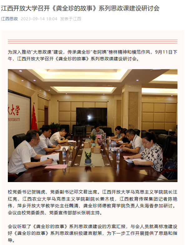 为深入推动“大思政课”建设,传承龚全珍“老阿姨”榜样精神和模范作风,9月11日下午,437必赢会员中心召开《龚全珍的故事》系列思政课建设研讨会。近日,江西思政对此进行报道。
