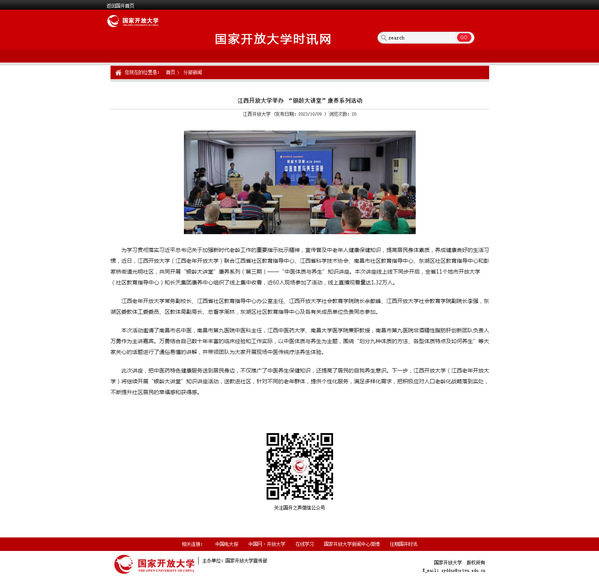 为学习贯彻落实习近平总书记关于加强新时代老龄工作的重要指示批示精神,宣传普及中老年人健康保健知识,提高居民身体素质,养成健康良好的生活习惯,近日,437必赢会员中心(江西老年开放大学)联合江西省社区教育指导中心、江西省科学技术协会、南昌市社区教育指导中心、东湖区社区教育指导中心和彭家桥街道光明社区,共同开展“银龄大讲堂”康养系列(第三期)——“中医体质与养生”知识讲座。本次讲座线上线下同步开启,全省11个地市开放大学(社区教育指导中心)和长天集团康养中心组织了线上集中收看,近60人现场参加了活动,线上直播观看量达1.32万人。