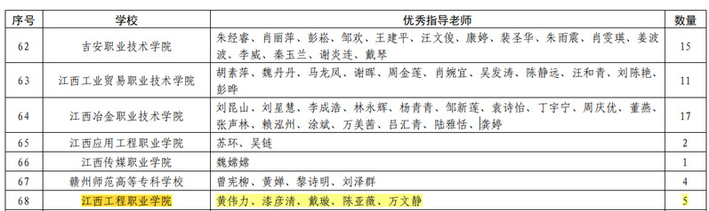 在2023年江西省大学生科技创新竞赛中,学校在信息安全、工业设计、信息技术知识、BIM毕业设计、成图技术与产品信息建模、商业精英创新创业、电子商务“创新创业”、英语应用能力等多个项目中获奖16项。其中一等奖3个,二等奖5个,三等奖8个;黄伟力、漆彦青、戴璇、陈亚薇、万文静等5名教师获“优秀指导教师”荣誉称号;学校在信息安全(专科组)竞赛项目中获得团体总分第三名。