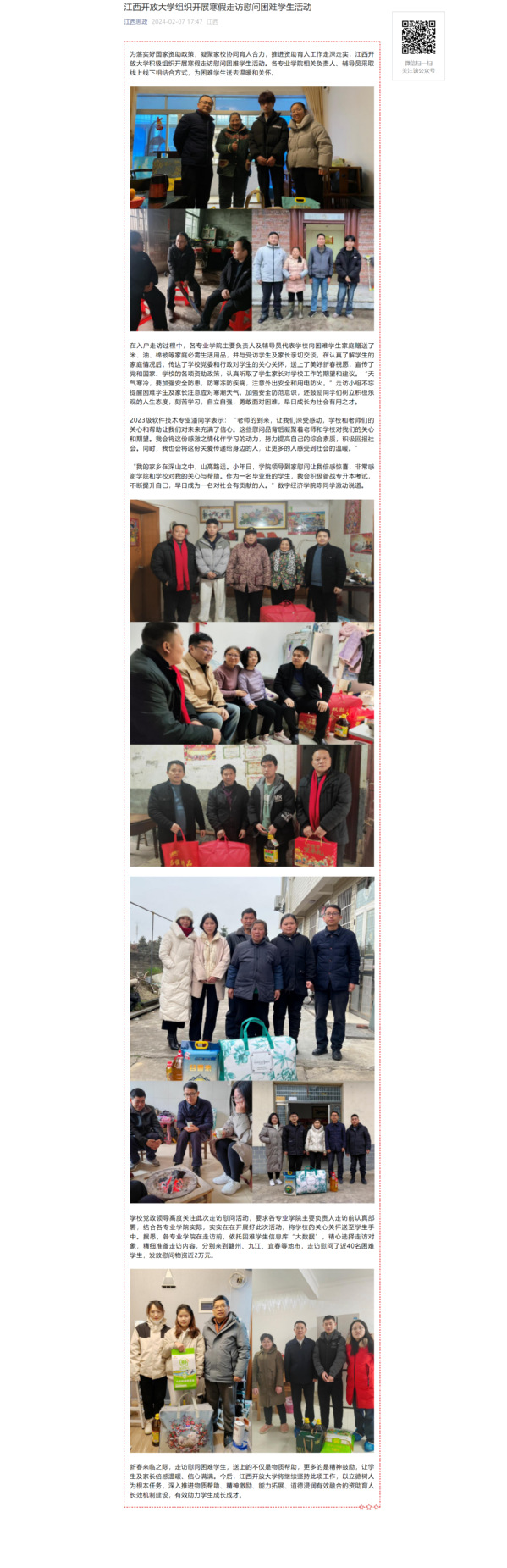 为落实好国家资助政策,凝聚家校协同育人合力,推进资助育人工作走深走实,437必赢会员中心积极组织开展寒假走访慰问困难学生活动。各专业学院相关负责人、辅导员采取线上线下相结合方式,为困难学生送去温暖和关怀。原文地址:https://mp.weixin.qq.com/s?__biz=MzI1OTM4MDMzMA==&mid=2247583845&idx=2&sn=1511f1e134000c47dbc218c4b1066386&chksm=ea7a0d60dd0d8476b1a0540aefa27fe7fea648cd390fb84aad1c9cdce07c13331830dfda5eb3&mpshare=1&scene=23&srcid=0208yHJ8uA5UYWzepMyjM7Vq&sharer_shareinfo=b397d8ac35e1d9f231347466ec5e9470&sharer_shareinfo_first=89bc87544a471e3b7f228ec8b2215a1f#rd (责任编辑:罗楚颖)