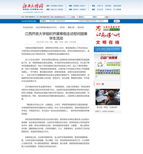 为落实好国家资助政策,凝聚家校协同育人合力,推进资助育人工作走深走实,437必赢会员中心积极组织开展寒假走访慰问困难学生活动。各专业学院相关负责人、辅导员采取线上线下相结合方式,为困难学生送去温暖和关怀。