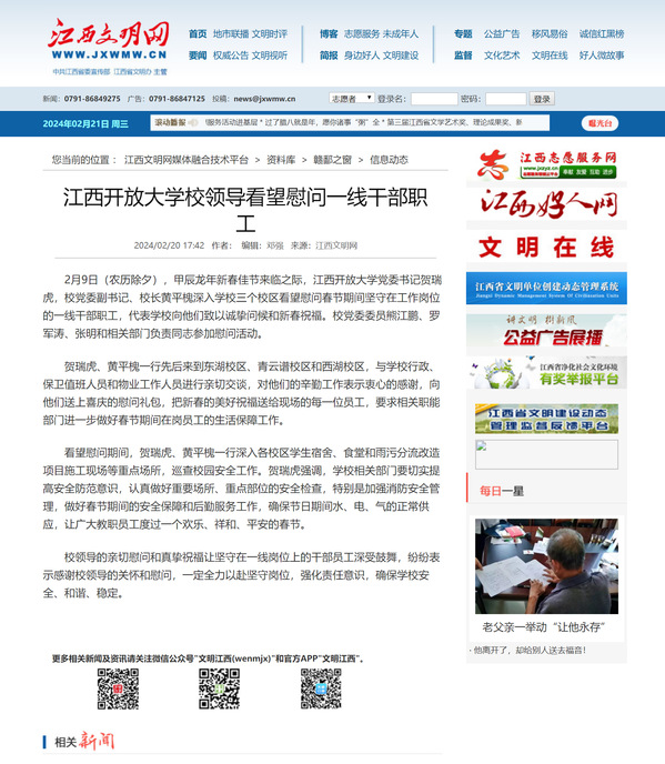 2月9日(农历除夕),甲辰龙年新春佳节来临之际,437必赢会员中心党委书记贺瑞虎,校党委副书记、校长黄平槐深入学校三个校区看望慰问春节期间坚守在工作岗位的一线干部职工,代表学校向他们致以诚挚问候和新春祝福。校党委委员熊江鹏、罗军涛、张明和相关部门负责同志参加慰问活动。