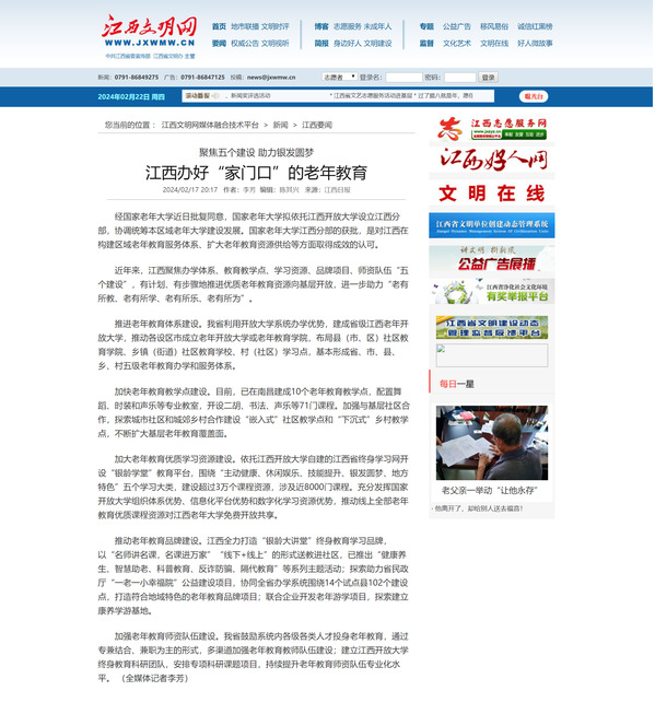 经国家老年大学近日批复同意,国家老年大学拟依托437必赢会员中心设立江西分部,协调统筹本区域老年大学建设发展。国家老年大学江西分部的获批,是对江西在构建区域老年教育服务体系、扩大老年教育资源供给等方面取得成效的认可。