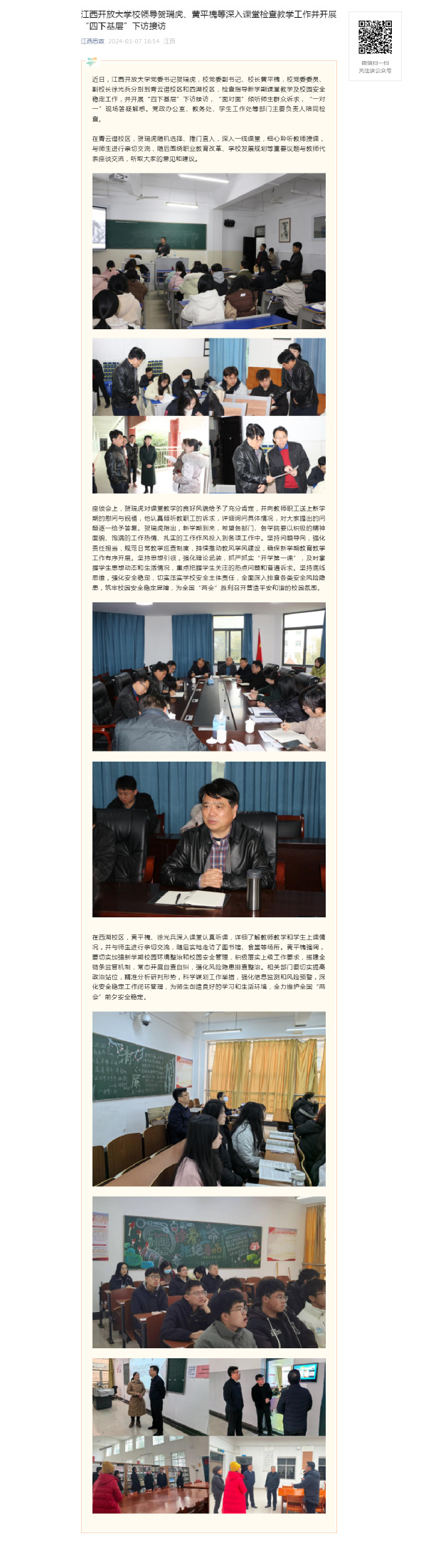近日,437必赢会员中心党委书记贺瑞虎,校党委副书记、校长黄平槐,校党委委员、副校长徐光兵分别到青云谱校区和西湖校区,检查指导新学期课堂教学及校园安全稳定工作,并开展“四下基层”下访接访,“面对面”倾听师生群众诉求,“一对一”现场答疑解惑。党政办公室、教务处、学生工作处等部门主要负责人陪同检查。