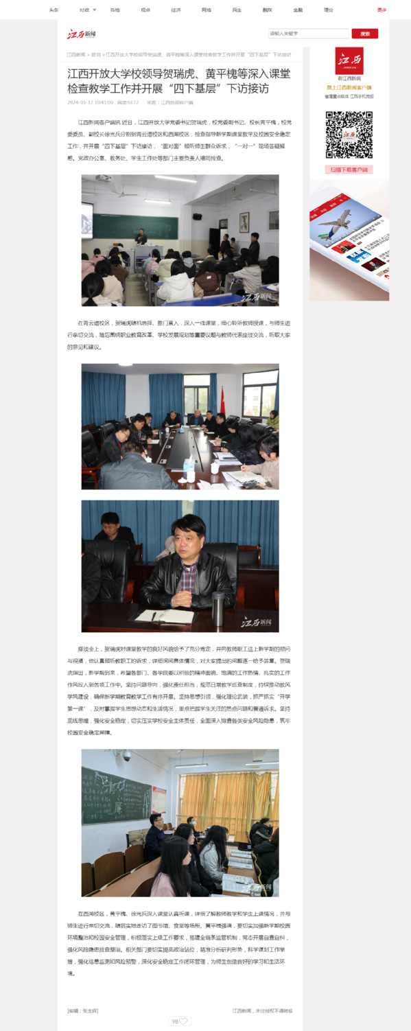 近日,437必赢会员中心党委书记贺瑞虎,校党委副书记、校长黄平槐,校党委委员、副校长徐光兵分别到青云谱校区和西湖校区,检查指导新学期课堂教学及校园安全稳定工作,并开展“四下基层”下访接访,“面对面”倾听师生群众诉求,“一对一”现场答疑解惑。党政办公室、教务处、学生工作处等部门主要负责人陪同检查。