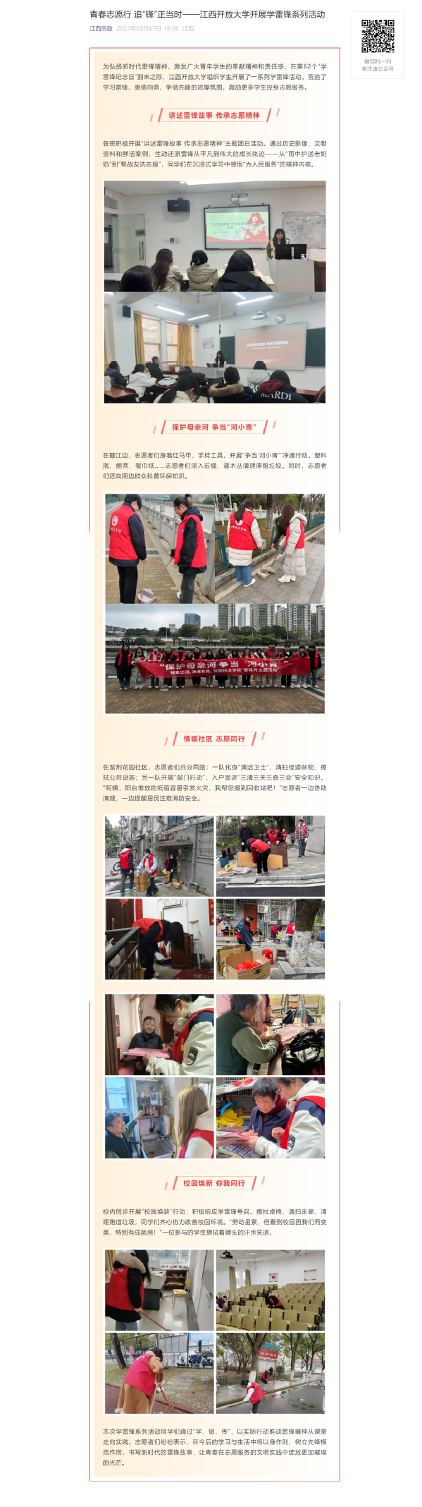 为弘扬新时代雷锋精神,激发广大青年学生的奉献精神和责任感,在第62个“学雷锋纪念日”到来之际,437必赢会员中心组织学生开展了一系列学雷锋活动,营造了学习雷锋、崇德向善、争做先锋的浓厚氛围,激励更多学生投身志愿服务。原文地址:https://mp.weixin.qq.com/s?__biz=MzI1OTM4MDMzMA==&mid=2247609165&idx=6&sn=3b05f551b62a373a327b0b6110b9cf7c&chksm=eb33d19d9d41148b8e7c59669604c7754c5d3cc911ee3ee0d3e8694eea0e3811052b2e34bf23&mpshare=1&scene=1&srcid=0309jBCDyaSReW3e0q3iaskX&sharer_shareinfo=97334ef659e0f4b58c8824c3d57085c6&sharer_shareinfo_first=97334ef659e0f4b58c8824c3d57085c6&exportkey=n_ChQIAhIQm7gVmI2hWUO6vd%2BePO%2F3AxL1AQIE97dBBAEAAAAAAHbnFhBfPTcAAAAOpnltbLcz9gKNyK89dVj0jjH8TjEbNDfzydhu9W76IRdqs%2FY7YZOqiHm2wcEK0ygeFQbwwn9wZVZr38jnvj3F2pMI9RgeTqGtXjBUbZcMOL6f5PnhOt6IcGL1cj7mSOHen2RmWpQOBo8rKrpaUmgWpGQc7Plgt7Wy9WuG8zDxA9Nu19o5RQ8cjD1tca5%2FscVVPmFKaqNfXK5DQ%2BkCLkzDqvb%2FJryf%2FULY1jg203oovHNK9Z%2FrUIH2g%2BG3pfeSE%2B7jLt8QYrcPaHb9FWi26T2cOLlkfCQoXV4zfYs5Xmrt&acctmode=0&pass_ticket=jRO6fsgTxf3UgfsJ0%2FZOy3yCOYgzKwQKkz2f3sUT29hv1dGpDeKu%2BD6qt0OG7ixL&wx_header=0#rd (责任编辑:罗楚颖)