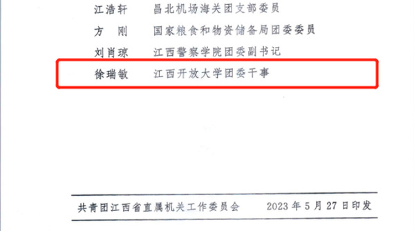 日前,共青团江西省直属机关工作委员会下发了《关于表彰2022年度省直机关先进团青组织优秀团员青年、优秀团青干部的通报》,必赢官网智能技术学院2021级数控技术专业学生邓浩获评“省直机关优秀团员青年”、必赢官网团委干事徐瑞敏老师获评“省直机关优秀团青干部”。