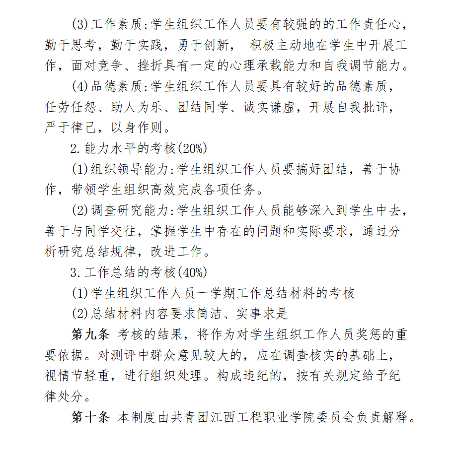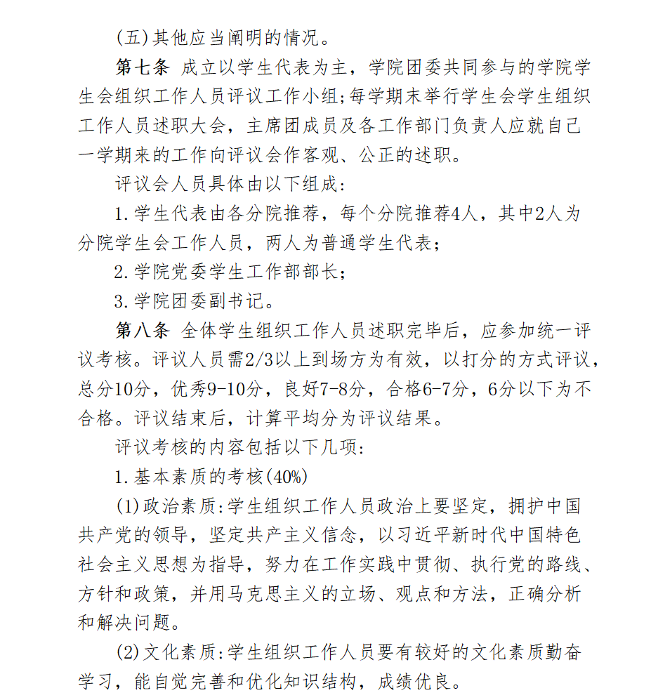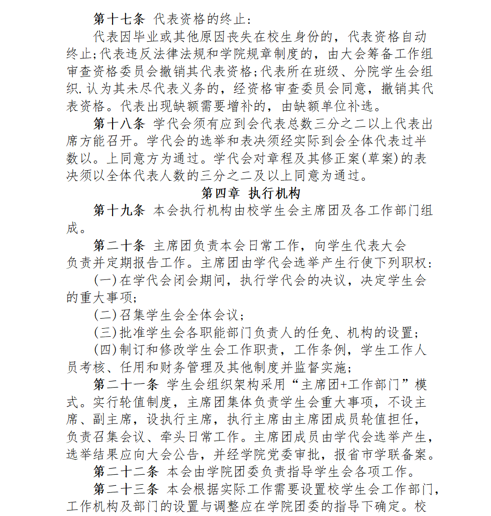 14. 组建以学生代表为主,校党委学生工作部门、校团委等共同参与的校级学生会组织工作人员评议会;主席团成员和工作部门负责人每学期向评议会述职。 | ☑是 □否 | |