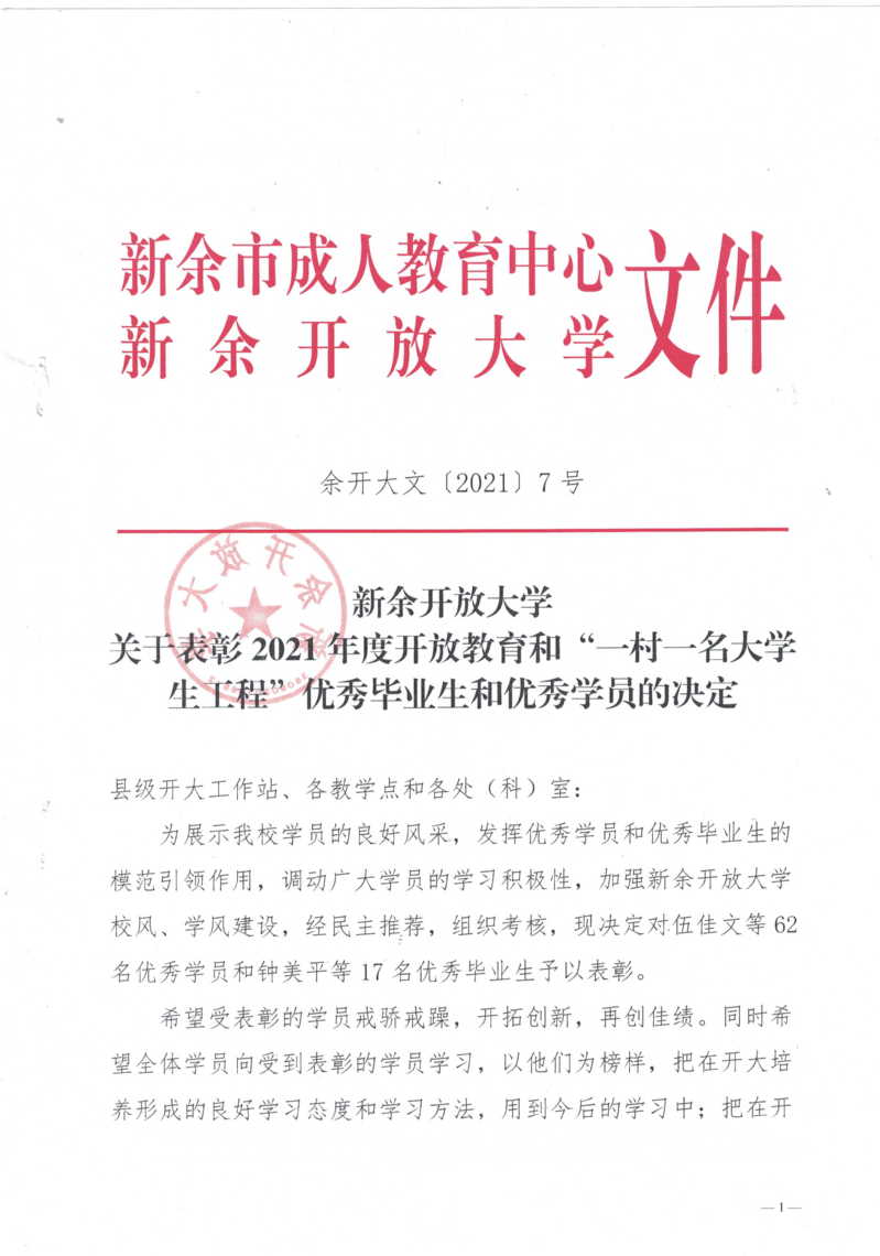 新余开放大学关于表彰2021年度开放教育和“一村一名大学生工程”优秀毕业生和优秀学员的决定