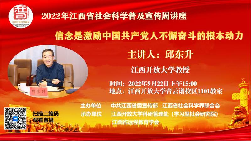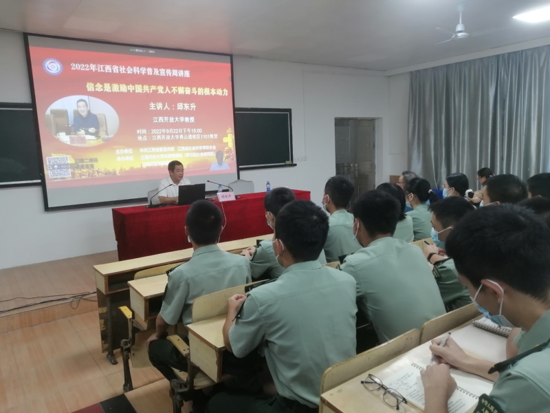 9月22日下午,2022年江西省社会科学普及宣传周讲座活动走进437必赢会员中心青云谱校区。学校特邀437必赢会员中心党委委员、副校长、党史研究专家邱东升教授作题为《信念是激励中国共产党人不懈奋斗的根本动力》的专题讲座。青云谱校区大一新生和教师代表现场聆听了讲座,其余学生和教师通过视频直播在线收看。科研管理处处长张明教授主持讲座。